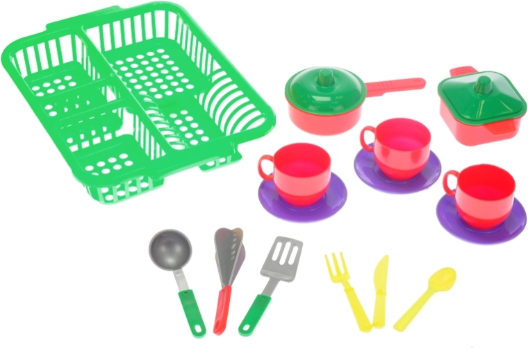 Dieses Kindergeschirr-Set mit praktischem Abtropfständer bietet alles, was man für Koch- und Aufräumspiele in der Küche braucht. Dank der drei Farbvarianten wird das Spiel noch abwechslungsreicher und Kinder können sich leicht eigene Küchenrituale ausdenken.