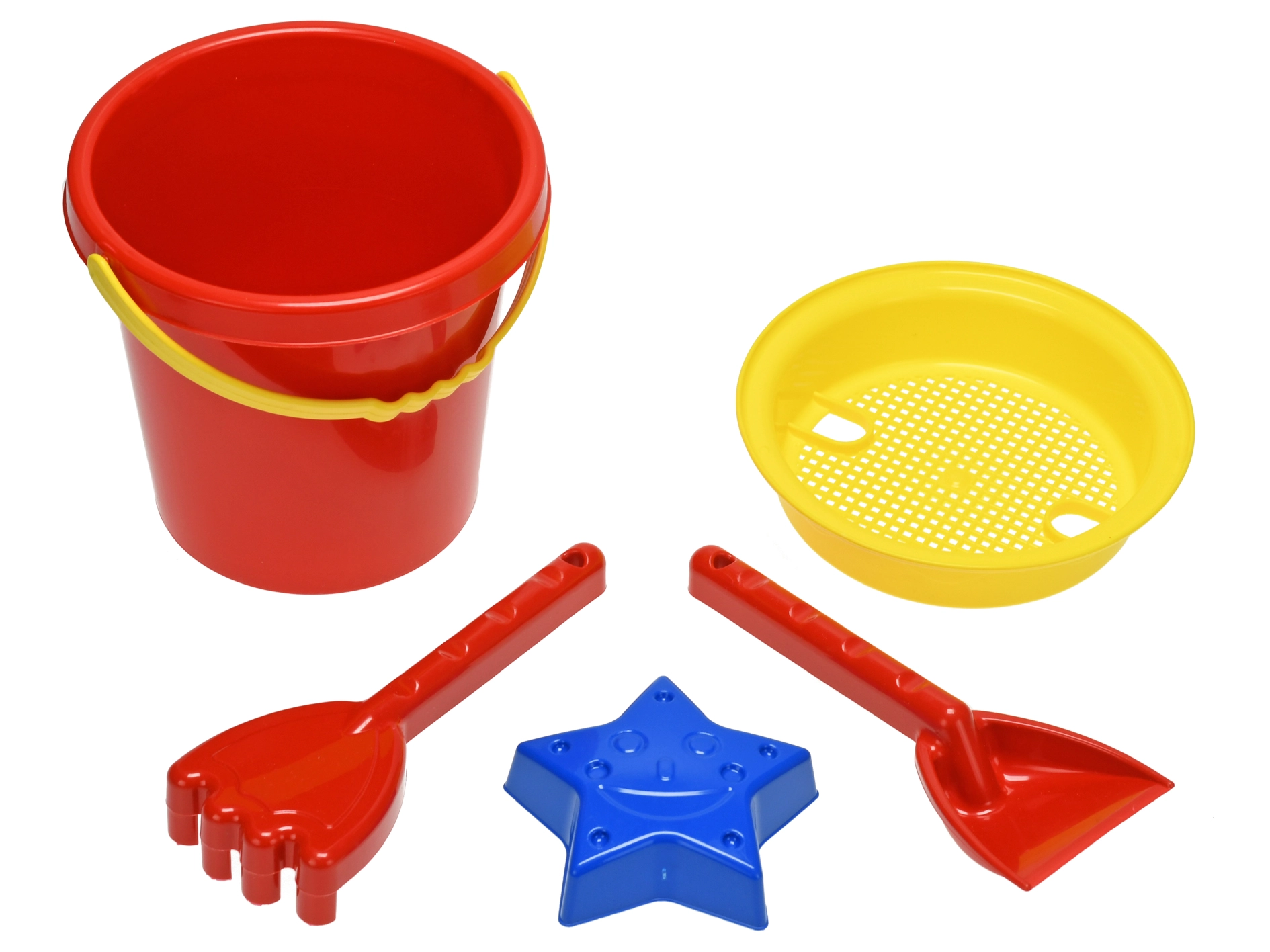 Ein komplettes Set mit den Grundwerkzeugen – Eimer 17 cm, Sieb, Schaufel, Harke und Sandform – bereit für Sandkasten und Strand.