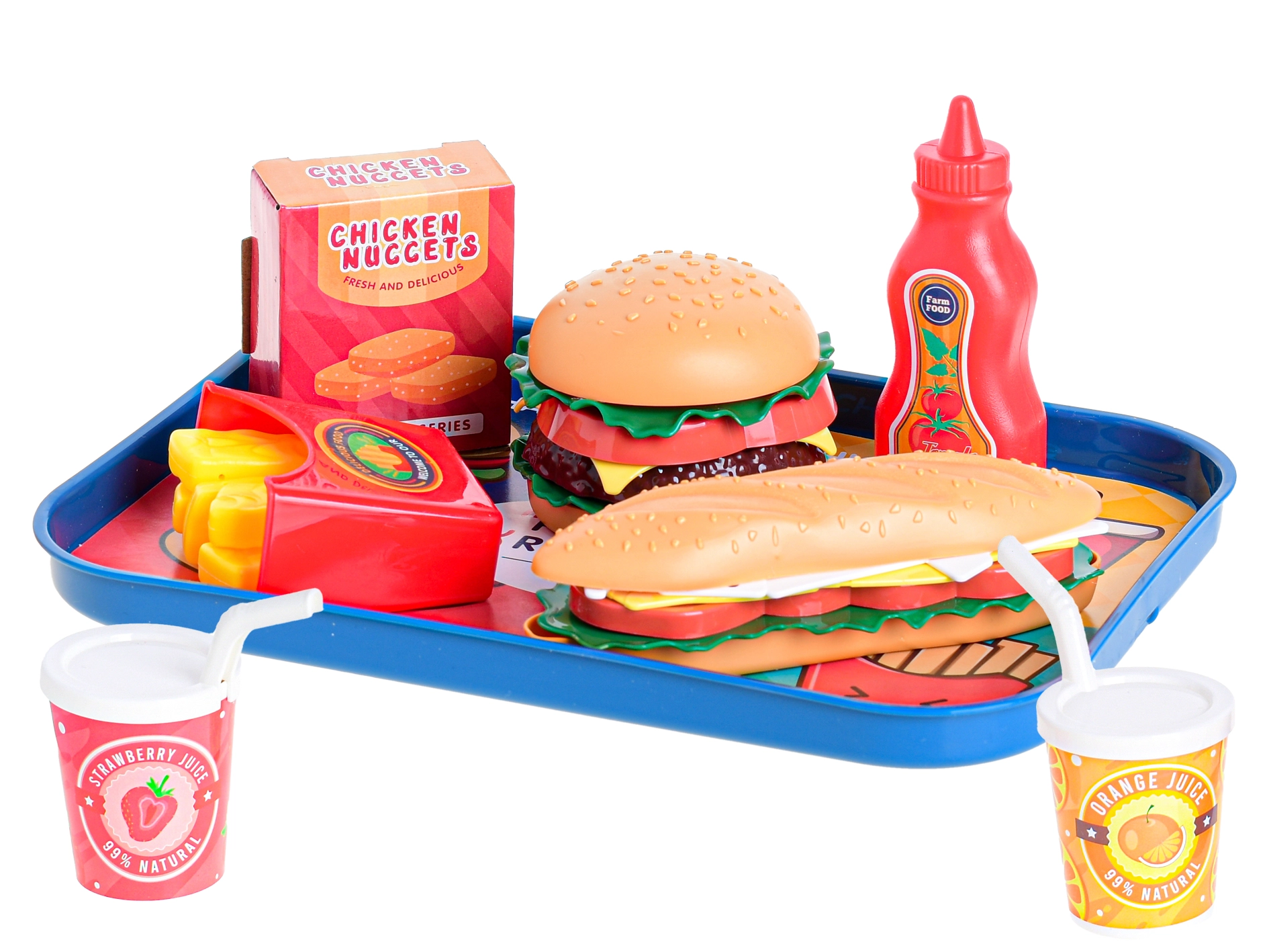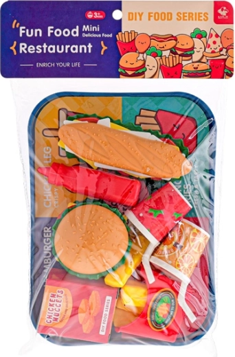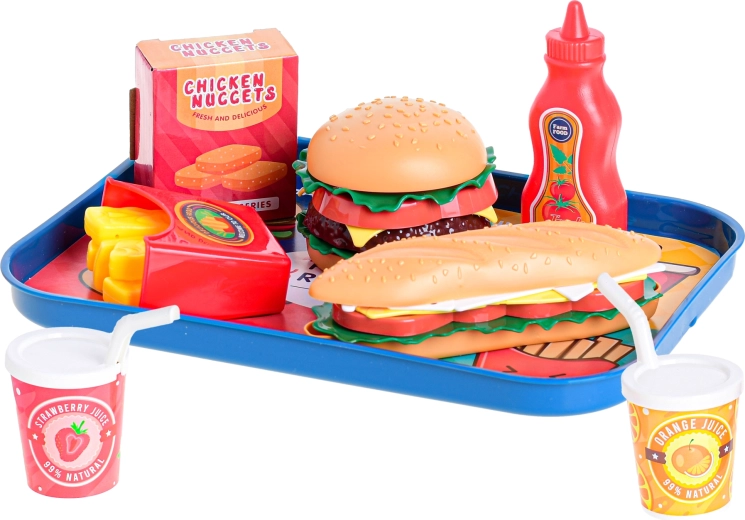 Der Lieferumfang umfasst Baguette, Burger, Limonaden, Nuggets, Pommes und ein Tablett, insgesamt 26 Teile. Kinder können dabei ihre Feinmotorik trainieren, Kommunikationsfähigkeiten entwickeln und ihre Fantasie beim Spiel von Verkäufer und Kunde entfalten.