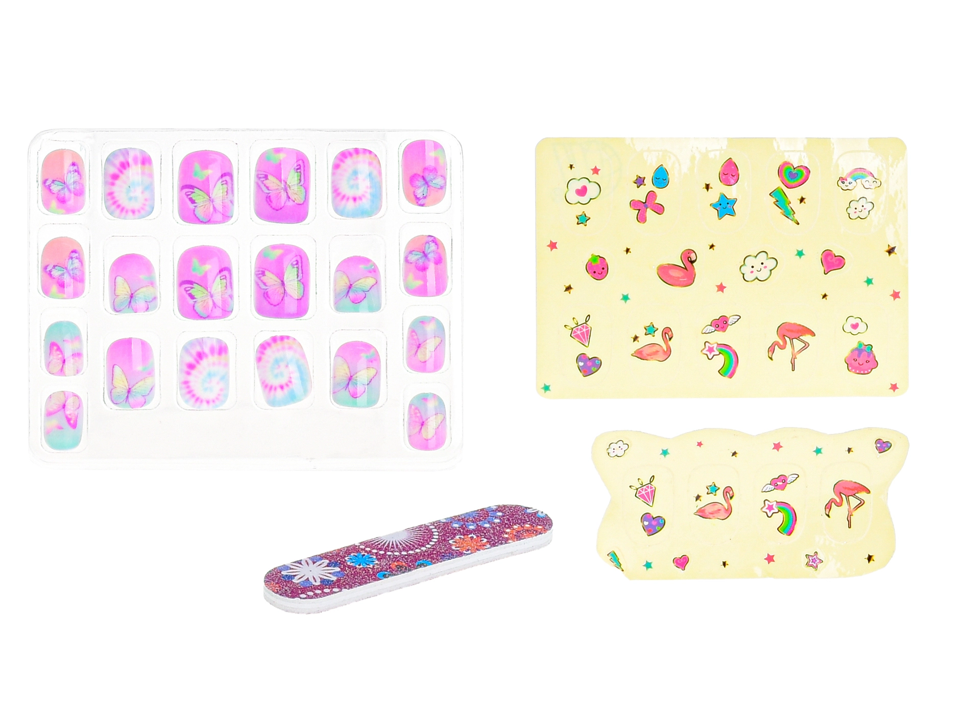 Das Set aus aufklebbaren Kinder-Nägeln mit Stickern und Nagelfeile verwandelt jedes Spiel in ein kreatives Erlebnis. Die Nägel lassen sich ohne Kleber einfach befestigen und sind daher für Kinderhände geeignet – sicher und schnell verziert. Dank verschiedener Farben und Aufkleber gestalten Kinder im Handumdrehen ihren eigenen Stil.