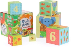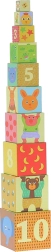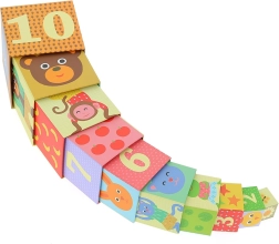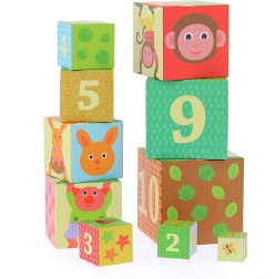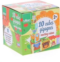 Dieser farbenfrohe Stapelturm der Marke VILAC besteht aus 10 robusten Kartonwürfeln mit nummerierten Seiten und Tierillustrationen. Kinder können die Würfel zu einem hohen Turm stapeln oder ineinanderstecken und trainieren so ganz natürlich Zahlenverständnis, Größenunterschiede und Gleichgewicht.
