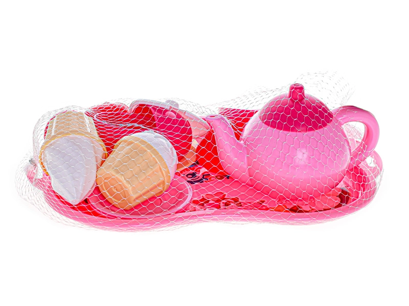 Enthalten sind ein dekoratives Tablett, eine Teekanne mit Deckel, Tassen mit Untertassen, Löffel, kleines Obst und süße Desserts im Eiscreme-Stil. Das Set wird in einem praktischen Netz aufbewahrt, wodurch es sich leicht transportieren und verstauen lässt.