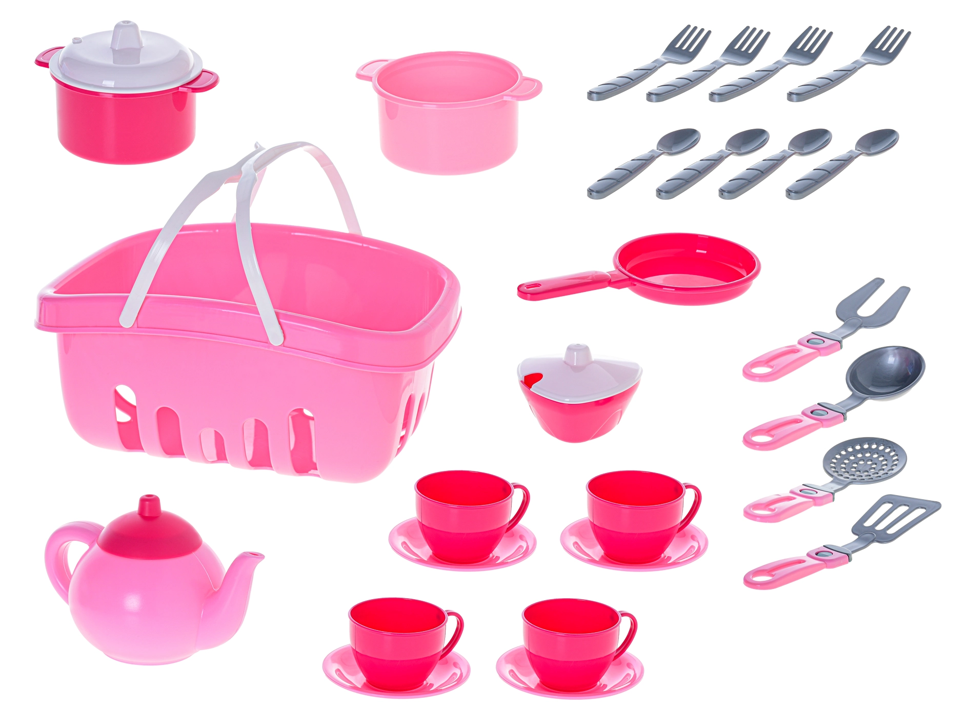 Entfache die Fantasie der Kinder mit diesem rosa Küchenset mit Korb, das 26 Teile Geschirr und Zubehör fürs Kochen und Teestunden bietet. Der leichte Korb mit Henkeln erleichtert Transport und Aufräumen, das robuste Kunststoffgeschirr ist ideal für sicheres und kreatives Spielen ab 3 Jahren.