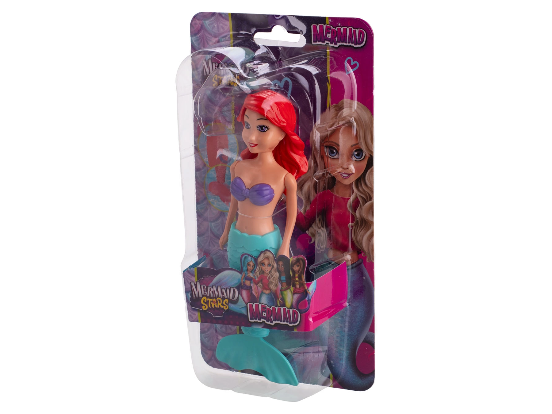 Wählen Sie aus drei Haarvarianten – rothaarig, schwarz oder blond – und verschiedenen Kombinationen von Flossenfarben (lila/orange, lila/blau, orange/blau). Die Puppe besteht aus robustem Kunststoffmaterial und hält so täglichem Spielen sowie Kontakt mit Wasser stand.