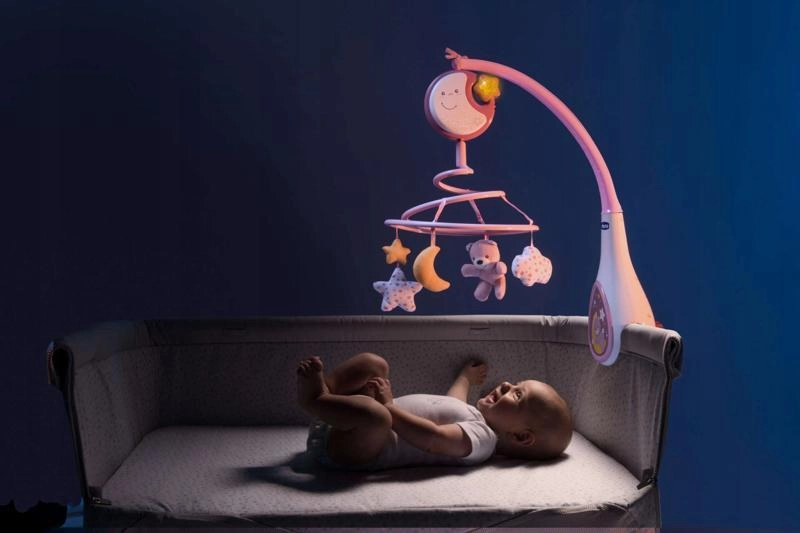 Dank der abnehmbaren elektronischen Einheit mit mondförmigem Licht verwenden Sie das Produkt auch außerhalb des Bettes – einfach an der Bettkante, am Kinderwagen oder am Griff des Autositzes befestigen. Die rotierende Spirale aus weichem, hypoallergenem Gewebe mit vier Hängespielzeugen fördert den Seh- und Aufmerksamkeitsfokus des Kindes und unterstützt ein entspanntes Einschlafen.