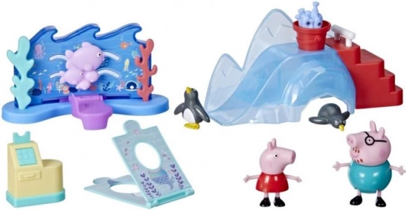 Aquarium-Spielszene, Peppa-Figur, Papa-Figur, 2 Pinguine, Eimer mit Fischen, drehbarer Fotoständer, aktiver Hintergrund, Kasse mit Knopf und Ticket, Blase mit Seestern