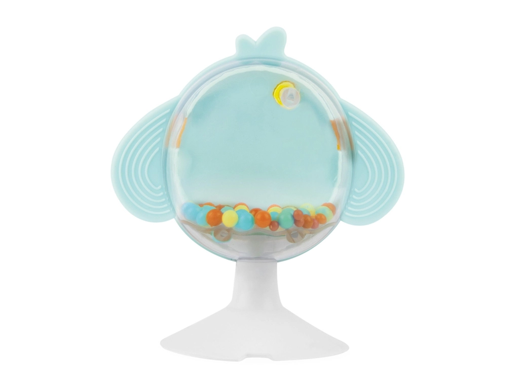 Der stabile Saugnapf hält das Spielzeug auf dem Tablett des Hochstuhls. Strukturierte Flügel aus weichem Kunststoff beruhigen das Zahnfleisch, bunte Kugeln im Körper fördern die auditive und visuelle Stimulation.
