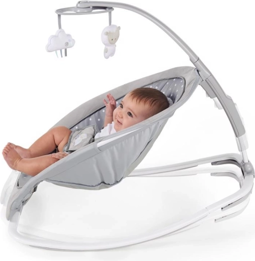 Dank des schlanken Klapprahmens lässt sich die Wippe schnell nahezu flach zusammenlegen – ideal, um zu Hause Platz zu sparen oder für unterwegs. Das abnehmbare Mobile mit zwei Plüschspielzeugen regt die Sinne an und sorgt für Unterhaltung, die Spielzeuge können jederzeit für das freie Spiel abgenommen werden. 5-Punkt-Gurte und die stabile Konstruktion gewährleisten eine ruhige und sichere Nutzung.