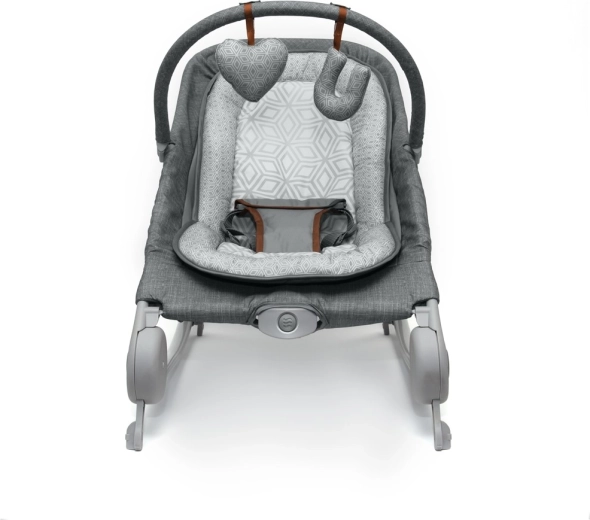 Praktische Details, die jeder Elternteil schätzt: komplett flach zusammenklappbar für einfaches Verstauen und Reisen, abnehmbarer Spielbügel mit zwei weichen Spielzeugen zur sensorischen Stimulation und pflegeleicht dank maschinenwaschbarem Sitzbezug. Das moderne, neutrale Design fügt sich in jedes Interieur ein.