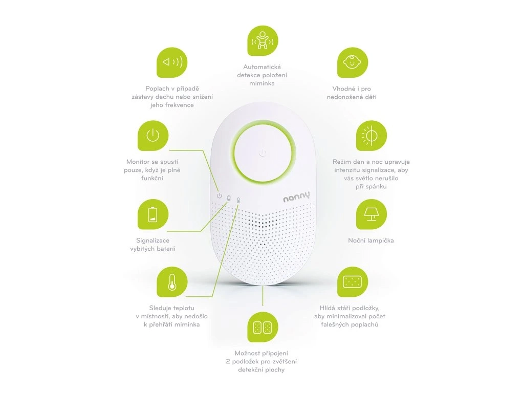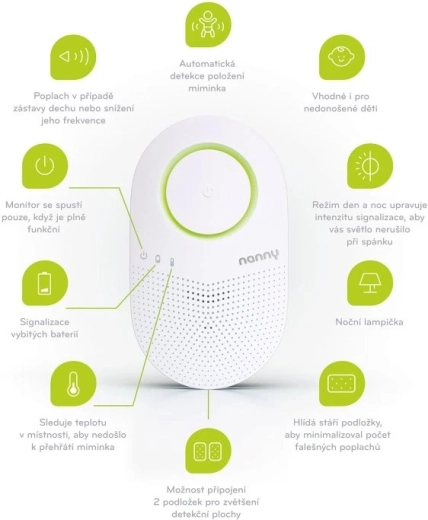 Dank der einzigartigen Erkennung der Babyablage weist Nanny darauf hin, wenn das Baby auf der Matte liegt, der Monitor jedoch nicht eingeschaltet ist. Der smarte Autotest beim Einschalten prüft zusätzlich den Gerätezustand sowie die Lebensdauer der Sensormatte. Für eine komfortable nächtliche Nutzung sind eine integrierte Lampe mit automatischer Dimmfunktion der Anzeigen sowie die Überwachung der Raumtemperatur vorhanden, was hilft, Überhitzung – einen Risikofaktor für SIDS – zu vermeiden.