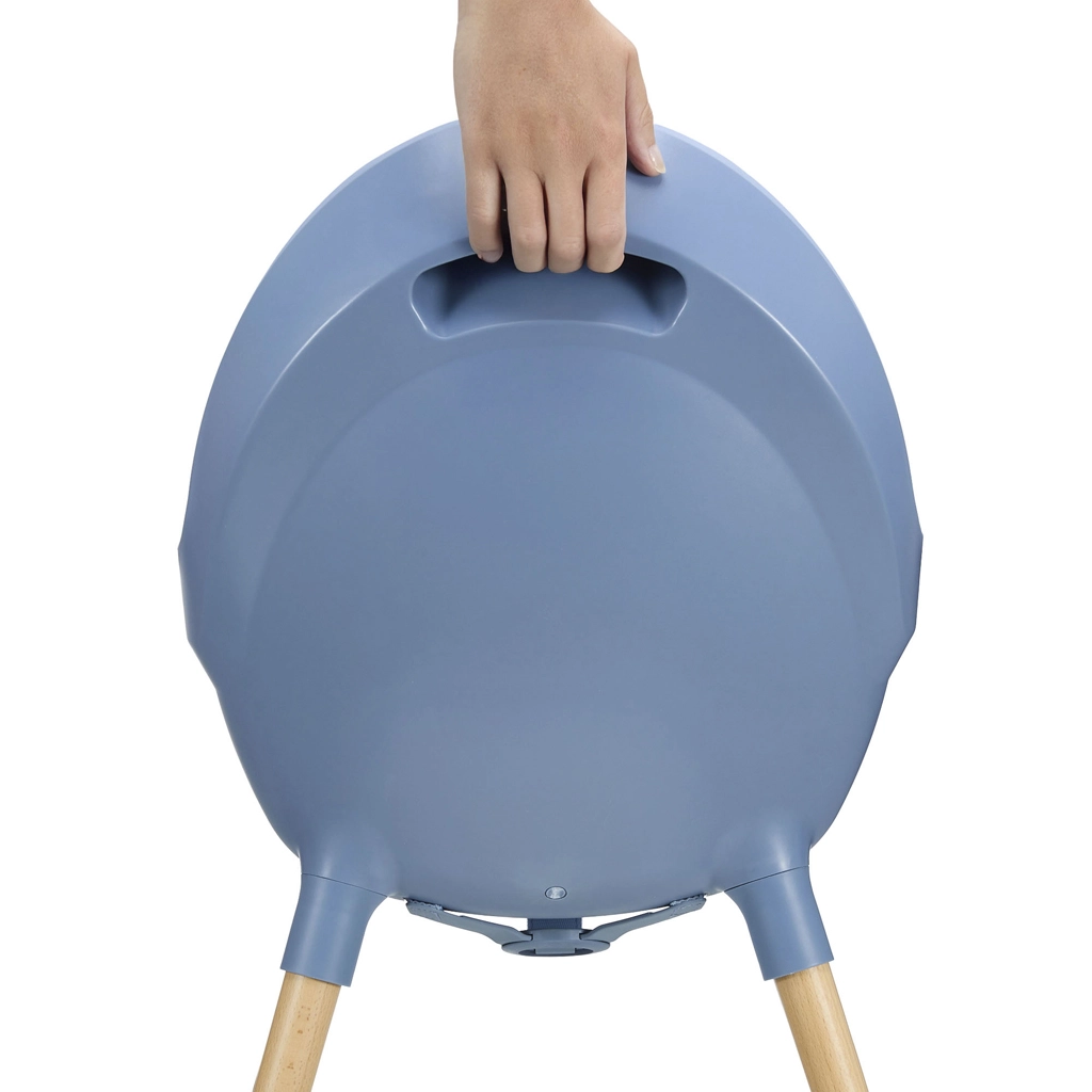 Stabile Buchenholzbeine mit rutschfesten Endkappen, 5-Punkt-Sicherheitsgurte und ein Schrittbügel gewährleisten ein hohes Maß an Sicherheit. Eine ergonomische Rückenlehne, eine breite und tiefe Sitzfläche sowie eine verstellbare Fußstütze sorgen für Komfort beim Essen und Spielen. Ein integrierter Griff an der Rückenlehne ermöglicht das einfache Tragen mit einer Hand.