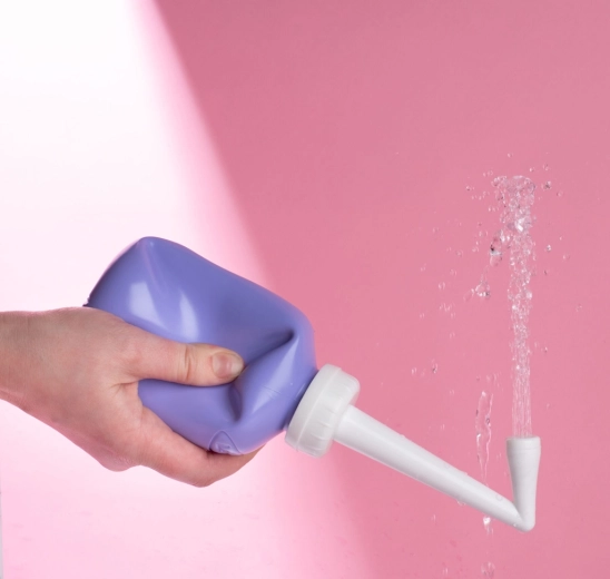 Auf der Toilette, die Spitze zum perinealen Bereich ausrichten, auch während des Wasserlassens zur Verdünnung des Urins verwenden