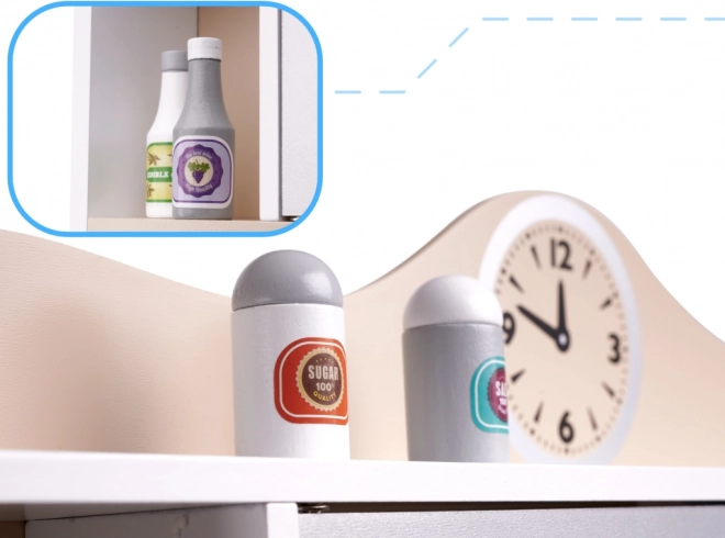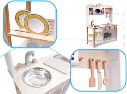 Lulilo Kuketo Holzspielküche für Kinder bietet endlose Möglichkeiten für Spaß und Entwicklung Ihres Kindes. Diese Küche verfügt über realistische Funktionen, darunter ein Spülbecken mit Wasserhahn, Herd, Mikrowelle und Stauraum in Form von Regalen und Schränken. Die Maße der Küche sind ideal für kleine Kinder, was einen einfachen Zugang zu allen Spielzeugelementen ermöglicht.