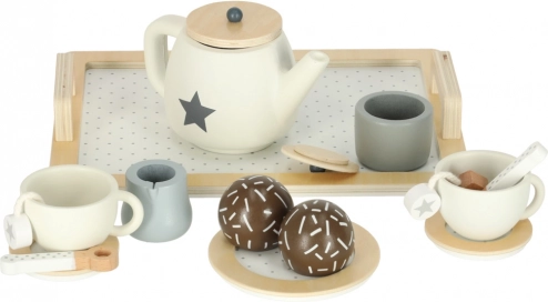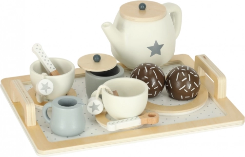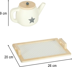 Elegantes Holz-Tee-Set in neutralen Farben mit Sternendetails – ideal für kindliche Teestunden. Kinder können Tee, Milch und „Dessert“ servieren, Höflichkeit und Kommunikation üben und gleichzeitig ihre Fantasie entfalten.
