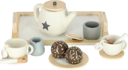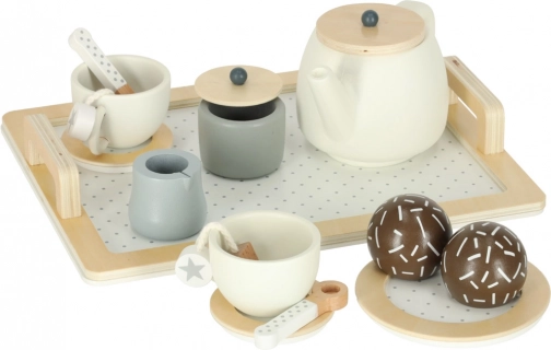 Alles auf einem Tablett: Kännchen, Tassen, Untertassen, Milchkännchen, Zuckerdose, Löffel und ein süßes Extra. Kinder können realistisch servieren und soziale Fähigkeiten trainieren.