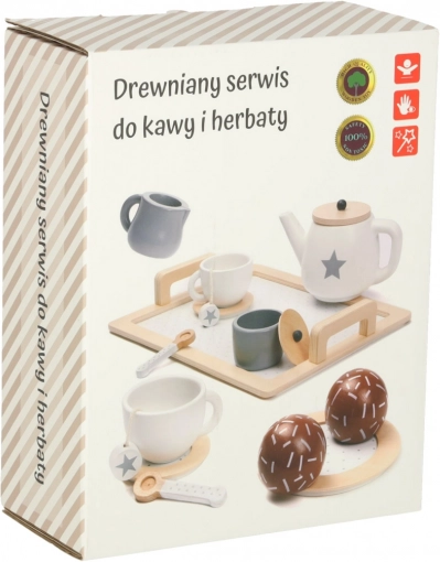 - 2× Tasse, 2× Untertasse, 1× Tablett, 1× Teekanne mit Deckel, 1× Zuckerdose, 1× Milchkännchen, 2× hölzerner „Donut“, 2× Teebeutel, 2× Löffel