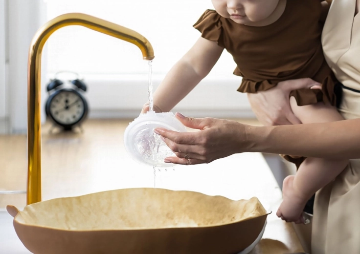 Die geschlossene Konstruktion verhindert Rückfluss und den Kontakt der Milch mit der Mechanik. Die Teile lassen sich zum Waschen und zur Sterilisation in kochendem Wasser oder im Sterilisator leicht zerlegen.
