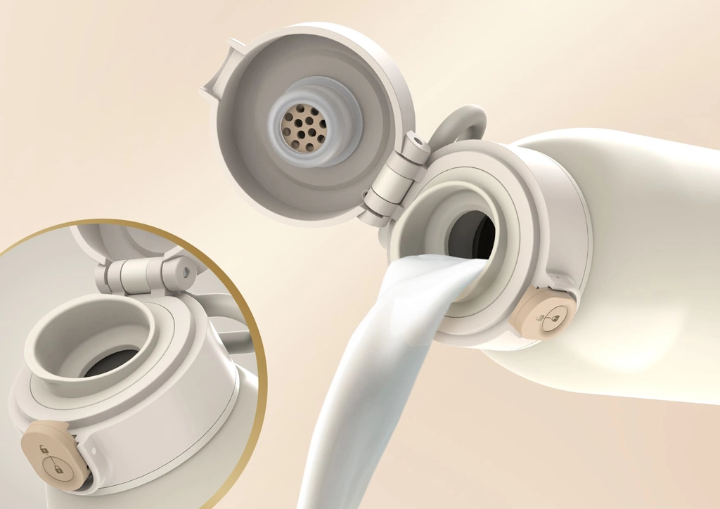 Der dicht schließende Verschluss mit Verriegelung verhindert das Auslaufen in der Tasche, und die geformte Ausgussöffnung sorgt für sauberes und präzises Ausgießen ohne Tropfen.