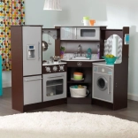 Die KidKraft Ultimate Corner Eckküche verwandelt das Kinderzimmer in einen echten Haushalt. Dank der durchdachten Eckanordnung wird der Raum optimal genutzt und Kindern wird alles geboten, was sie aus der Küche der Erwachsenen kennen – vom Spülbecken und Kochfeld bis hin zum Kühlschrank mit Eiswürfelspender und der Waschmaschine. Realistische Details wie das große Sichtfenster am Ofen, drehbare Knöpfe mit Klickgeräusch oder Haken für Utensilien unterstützen das fantasievolle Spiel.