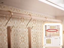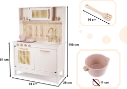 Der Ofen mit Rattan-Panel, der Oberschrank/Mikrowelle und die Hängeleiste mit Haken helfen Kindern, beim Spielen Ordnung und Organisation zu lernen.