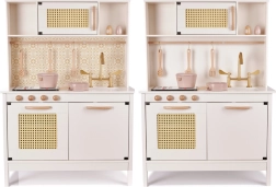 Diese von Retro- und Boho-Stil inspirierte Holzküche überzeugt mit einer eleganten Kombination aus Weiß, Creme und goldenen Details. Die meisten Elemente bestehen aus Holz/MDF, die Oberfläche ist glatt geschliffen und mit ungiftigen Farben lackiert – für sicheres Spielen. Drehknöpfe, zu öffnende Türen und Haken für Utensilien laden zum Entdecken ein und fördern Ordnungssinn und Organisation.
