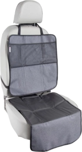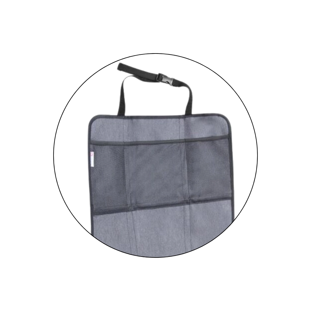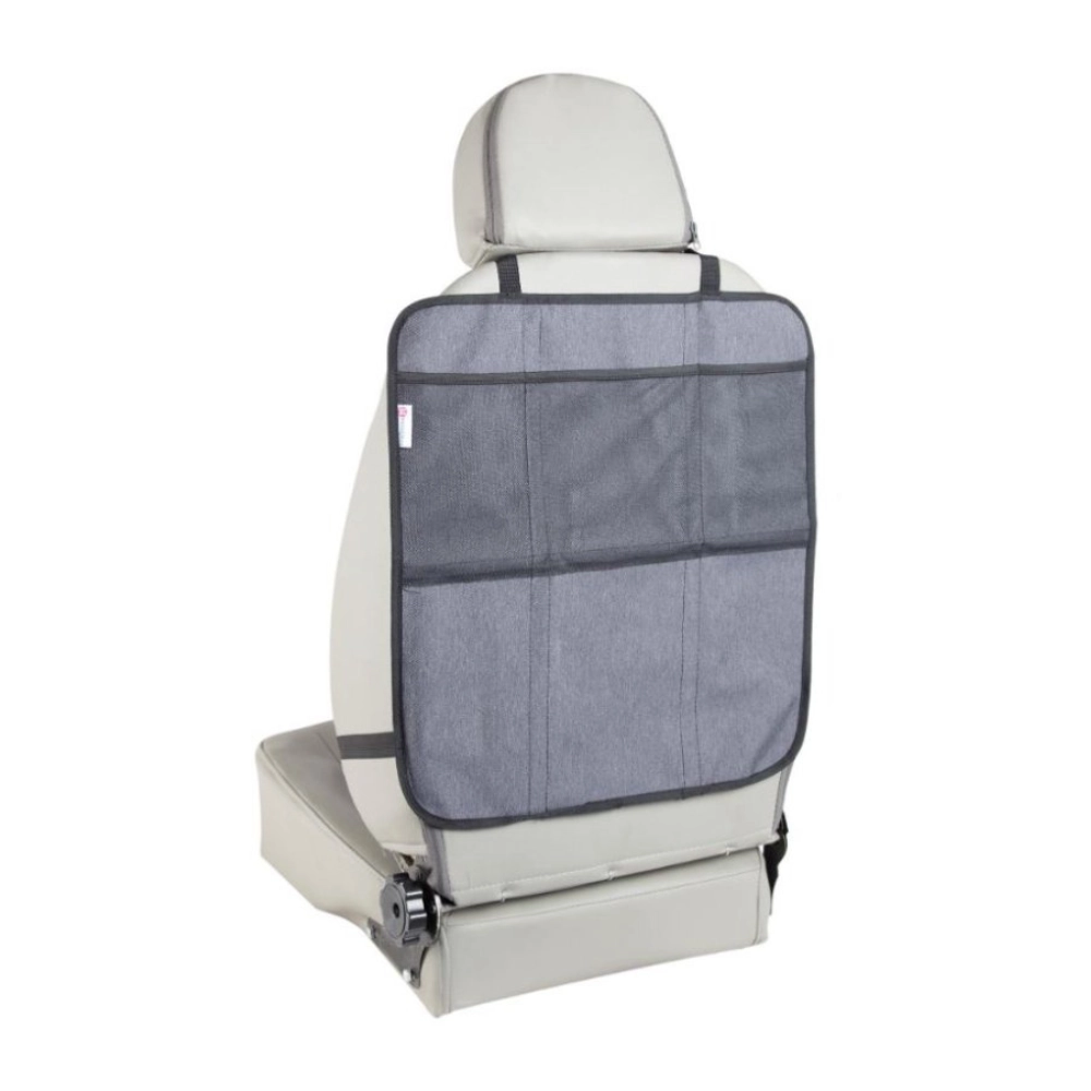Das Produkt kann in zwei separate Teile geteilt werden – das Unterteil bedeckt die Sitzfläche und die Vorderkante unter dem Kindersitz, während das Oberteil als Trittschutz mit Aufbewahrungsfächern dient. Die Installation gelingt im Handumdrehen dank verstellbarer Gurte und der universellen Befestigung an der Kopfstütze.