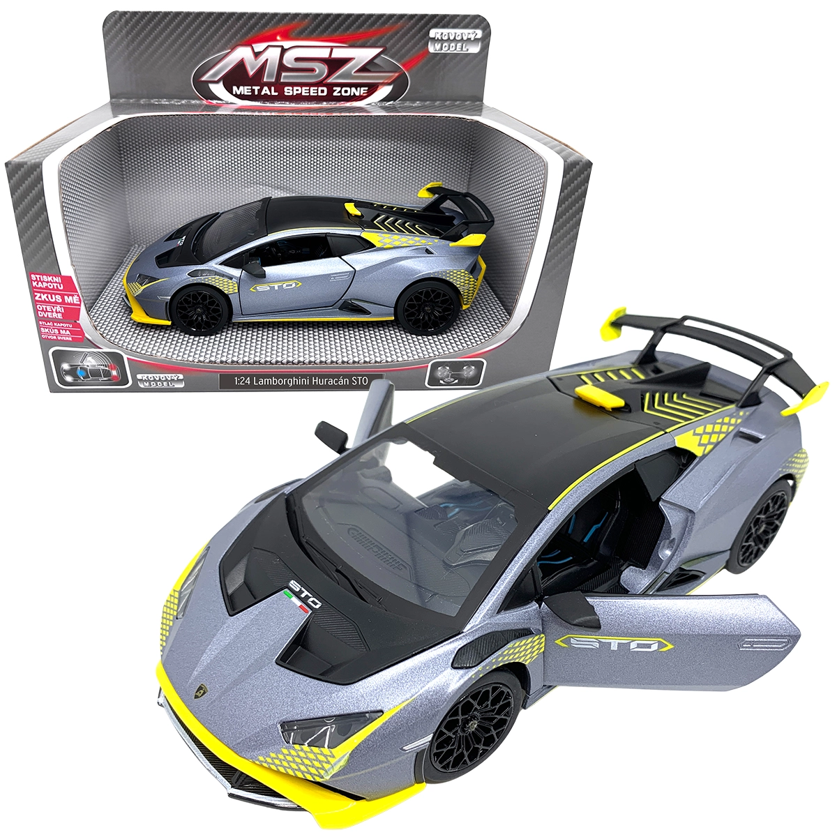 Dieses detailreiche Modell des LAMBORGHINI Huracán STO bringt das ikonische Design des Supersportwagens in einer robusten Metallausführung. Die elegante silbergraue Farbe, die sorgfältigen Karosserielinien und die realistischen Details machen es zu einem attraktiven Sammlerstück und zu einem großartigen Spielzeug für kleine Autoenthusiasten.