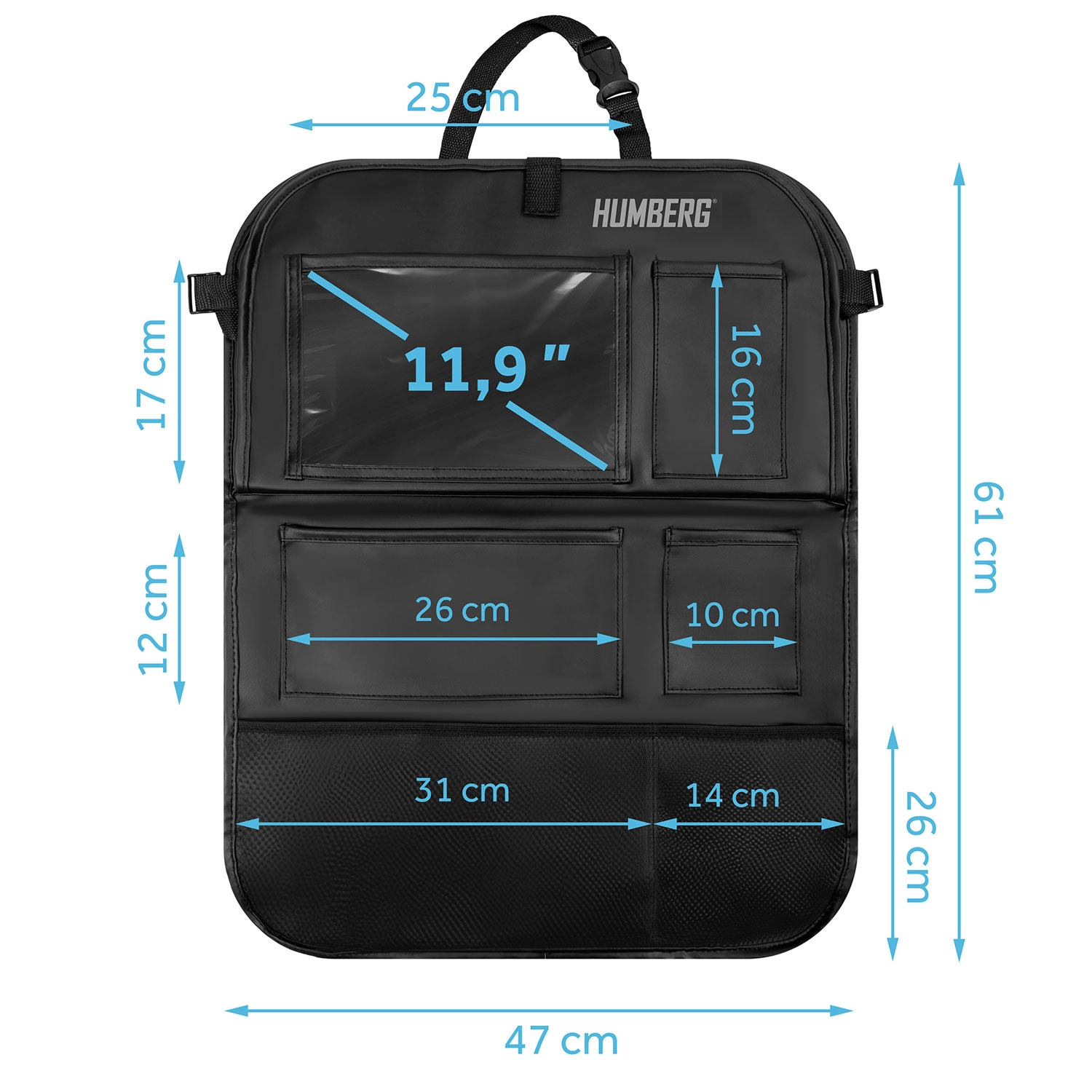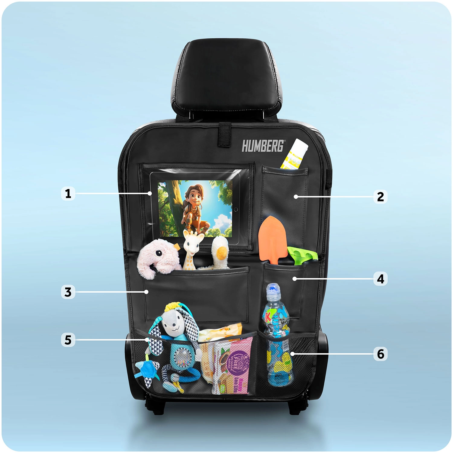 Verwandeln Sie Chaos auf der Rückbank in Ordnung. Der HUMBERG-Organizer bietet eine durchdachte Aufteilung des Stauraums: eine große transparente Tablet-Tasche (bis 11,9"), einen klappbaren Tisch für bequemes Schreiben und Snacken, elastische Getränkehalter sowie mehrere Fächer für Spielzeug, Bücher und Taschentücher. Die robuste Oberfläche aus PU-Kunstleder ist leicht zu reinigen und schützt die Rückenlehne vor Flecken und Tritten.