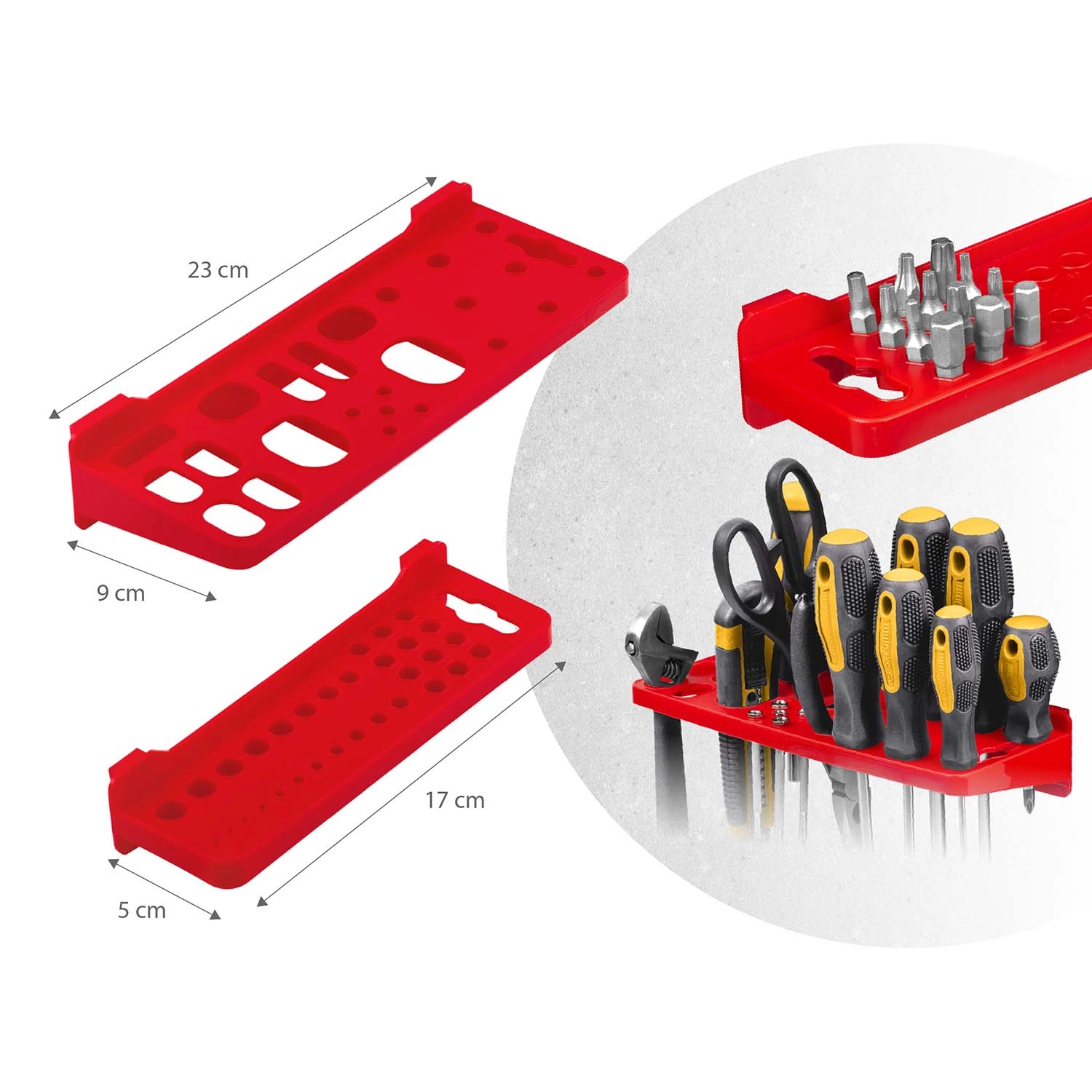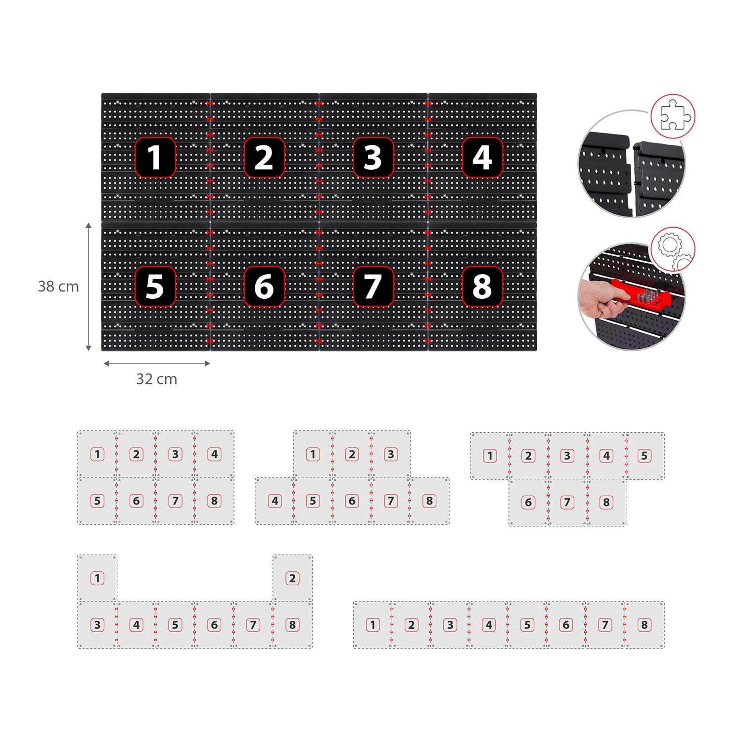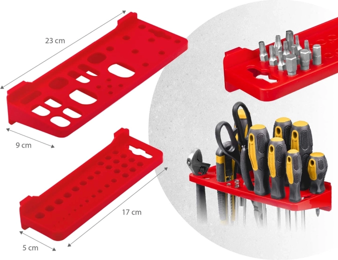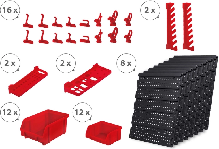 Lieferumfang: 6 modulare Paneele, 12 kleine Kuvetten (9,5 × 10 × 5 cm), 12 große Kuvetten (16 × 10 × 7,3 cm), 2 Ablagen 23 × 9 cm, 2 Ablagen 17 × 5 cm, 16 Halter und Haken, 2 Schlüsselhalter sowie Montagedübel für verschiedene Untergründe (Beton, Ziegel, Holz, Blech). Die Montage ist schnell und intuitiv – Elemente einfach in die Perforation einklicken und jederzeit umorganisieren.