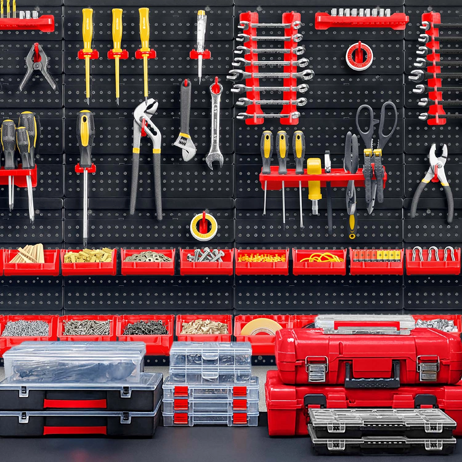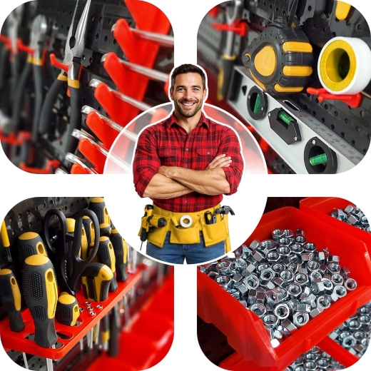 12 kleine und 12 große Kuvetten für Schrauben und Nägel, 16 Haken und Halter plus 2 Schlüsselhalter – einfaches Sortieren und schneller Zugang.