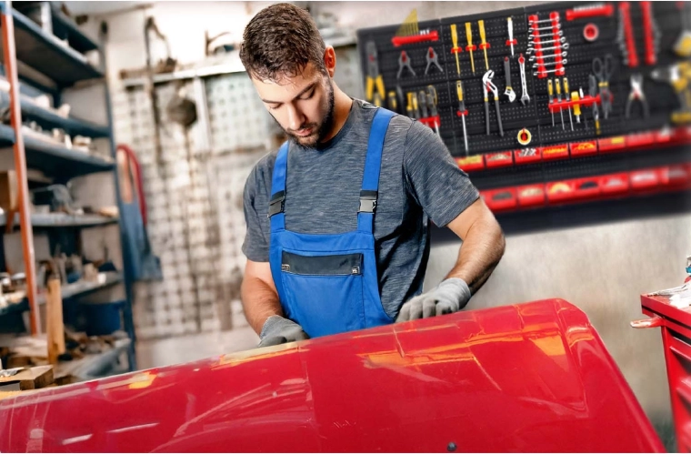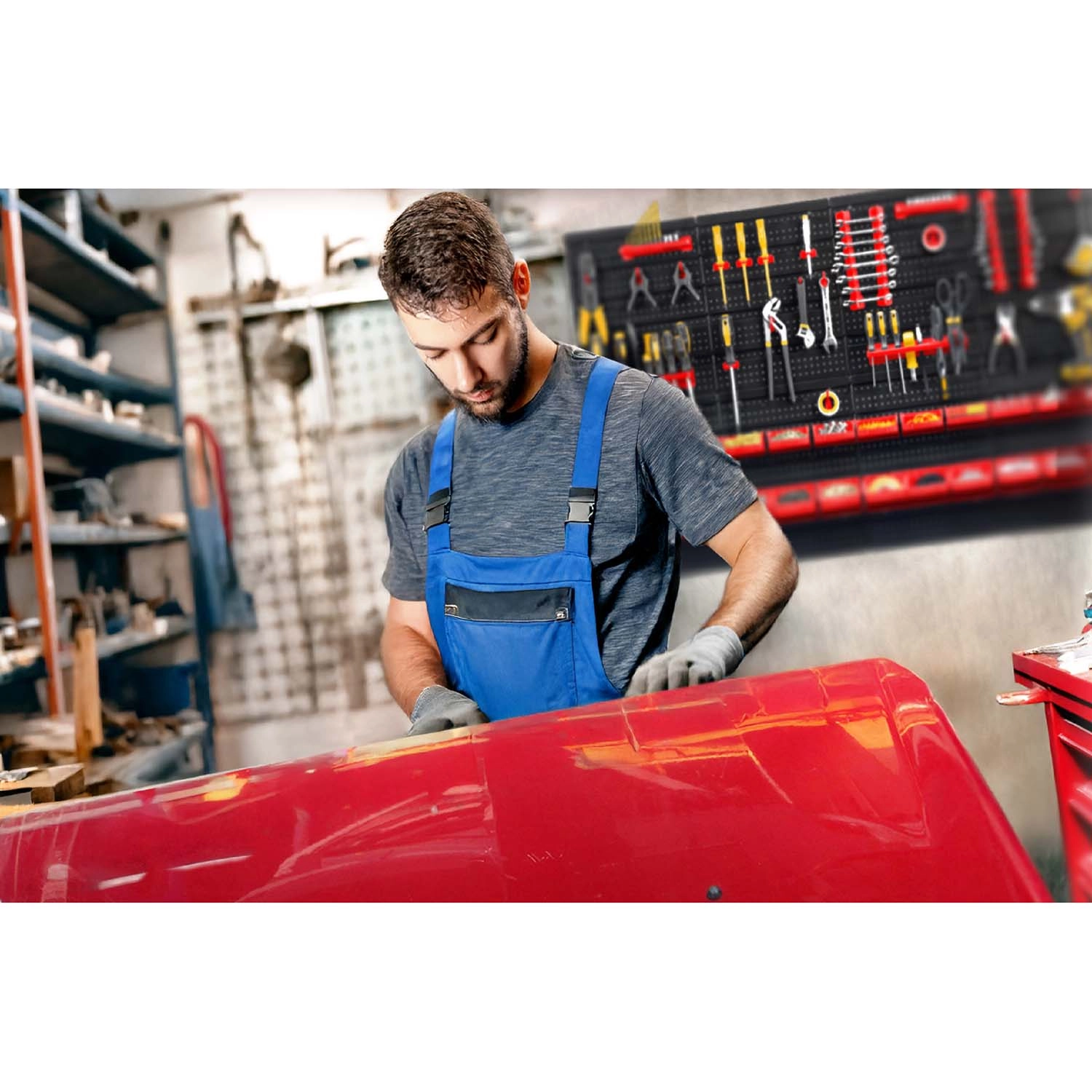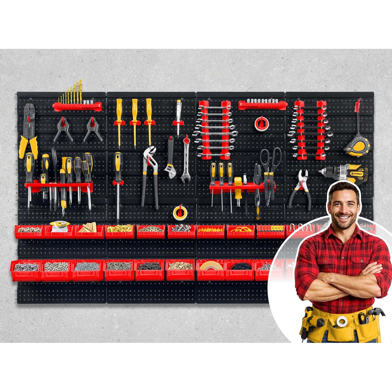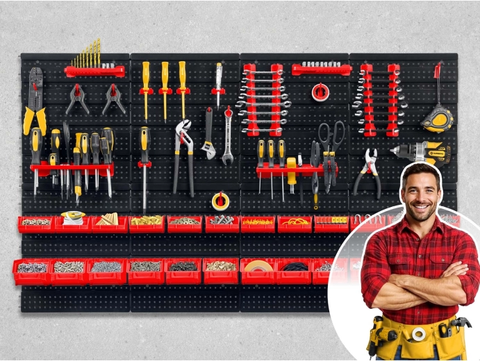 Sechs perforierte Paneele und 54 Zubehörteile ermöglichen die übersichtliche Aufbewahrung von Handwerkzeugen, Aufsätzen und Kleinteilen – stets griffbereit.