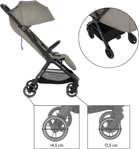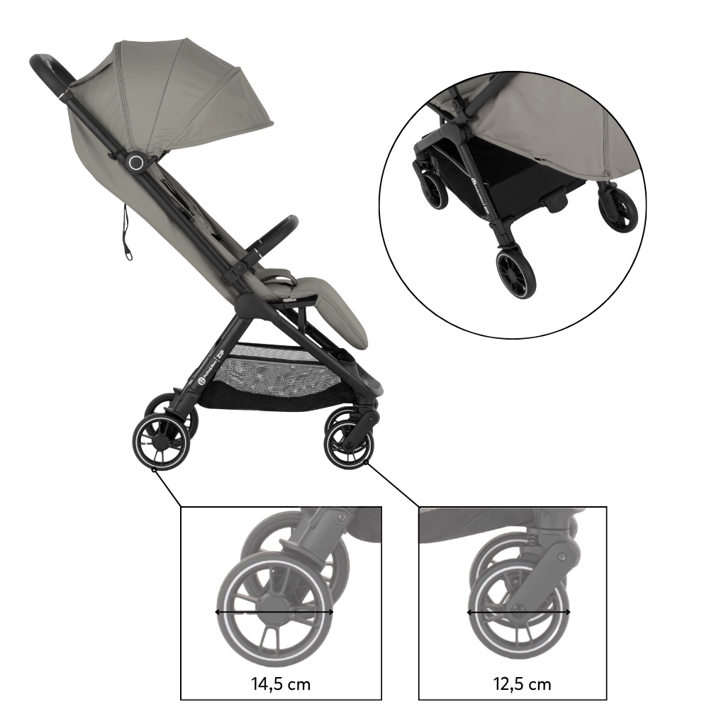 In der Stadt wie im Park überzeugen die gefederte EVA-Räder (vorn 5,5", hinten 6,5") für eine sanfte Fahrt sowie die praktische Seilzugbremse, die außerhalb der Schrittlänge platziert ist. Der Stauraumkorb mit 5 kg Traglast fasst Einkäufe und Notwendiges. Robuste Materialien lassen sich leicht reinigen, sodass der Buggy auch bei täglicher Nutzung großartig aussieht.