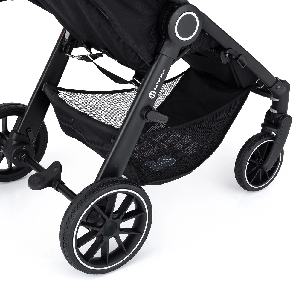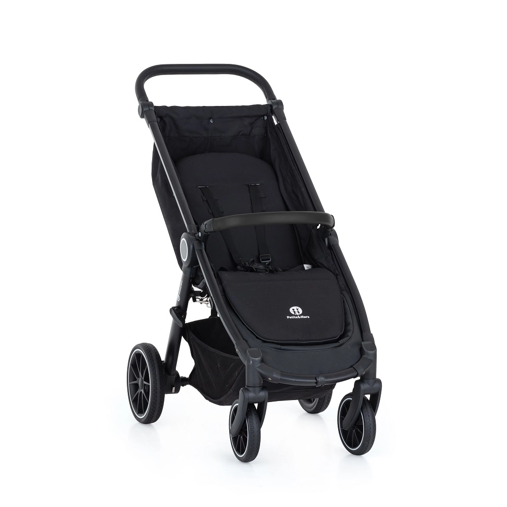 Der Petite&Mars Street+ RWS Black Limited 100 Palmtree ist ein eleganter und praktischer Kinderwagen, der auch anspruchsvolleres Terrain meistert. Das stabile, leicht gefederte Gestell und die großen RWS-Vollgummiräder sorgen für eine flüssige und sichere Fahrt ohne Pannenrisiko. Dank des einfachen Einhand-Faltmechanismus und der kompakten Maße im zusammengeklappten Zustand passt er hervorragend ins Auto und in kleinere Räume.