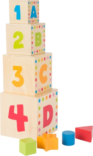 Jeder Würfel bietet Öffnungen zum Einsetzen der Formen sowie Aufdrucke mit Buchstaben und Zahlen – ideal für erste Zuordnungen, Sortieren und das Anordnen in die richtige Reihenfolge.