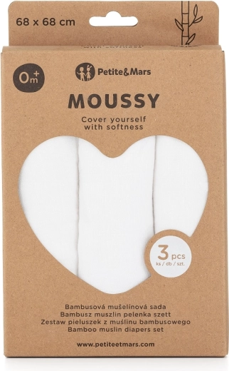 Das Set PETITE&MARS Moussy Total White umfasst drei flauschige Musselinwindeln aus 70 % Bambus und 30 % Baumwolle. Dank der feinen, luftigen Webart sind sie sanft selbst zur empfindlichsten Haut von Neugeborenen und nehmen Feuchtigkeit hervorragend auf. Nutzen Sie sie zu Hause und unterwegs – als Waschlappen, Kuschel- und Abtrockentuch, Unterlage, Lätzchen oder Spucktuch.