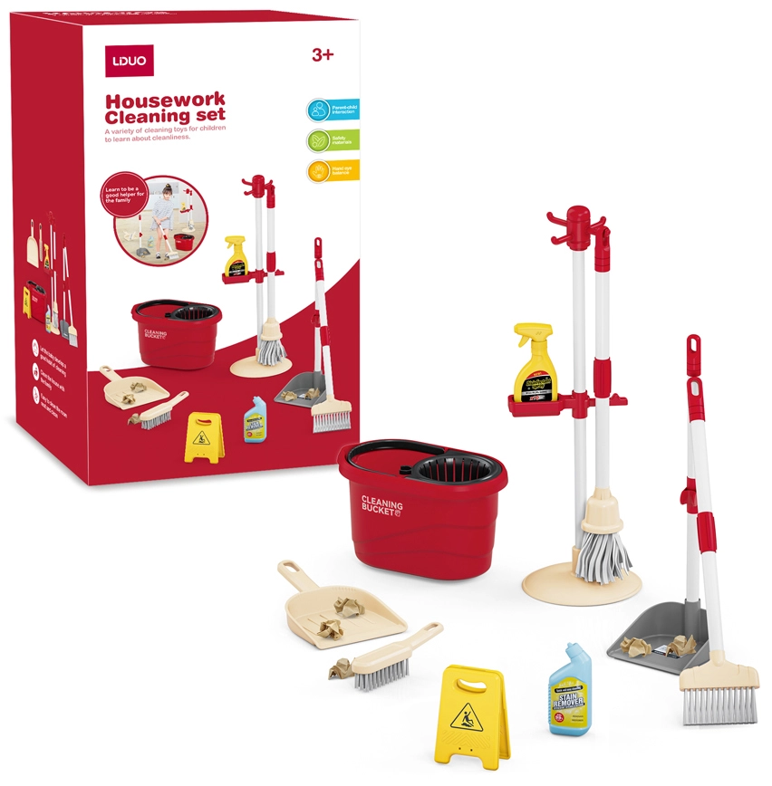 Zum Set gehören ein praktischer Mini-Mopp, ein Besen und weiteres nützliches Zubehör, das echten Werkzeugen nachempfunden ist. So verstehen Kinder, wie wichtig es ist, Ordnung zu halten, und trainieren gleichzeitig Koordination und Selbstständigkeit.