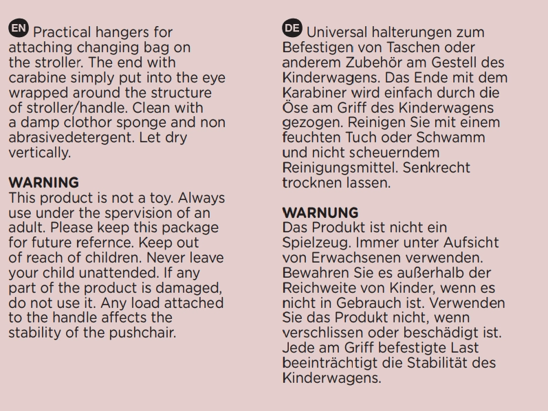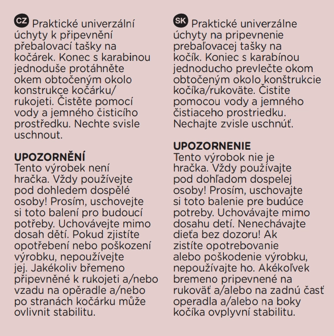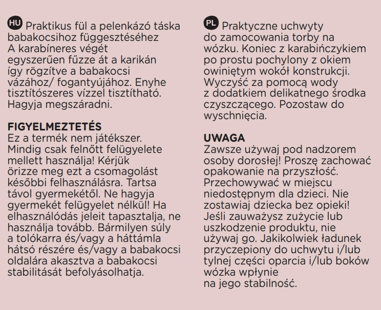 Die Lösung ist ideal für Wickeltaschen, Handtaschen und kleinere Einkäufe. Der flexible Gurt wird einfach um die Konstruktion gelegt, eingerastet und ist einsatzbereit. Die Pflege ist unkompliziert – Wasser und ein mildes Reinigungsmittel genügen.