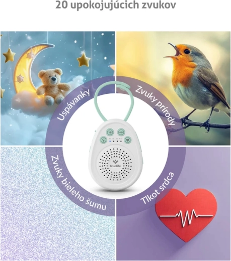 Wählen Sie aus Melodien, Naturgeräuschen, weißem Rauschen und authentischem Herzschlag für schnelle Beruhigung und leichteres Einschlafen Ihres Babys.