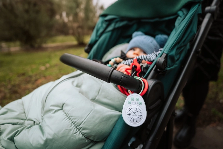 Lässt sich einfach am Kinderbett, Kinderwagen oder Autositz befestigen. Der ideale Helfer zu Hause und auf Reisen für ruhigen Schlaf überall.