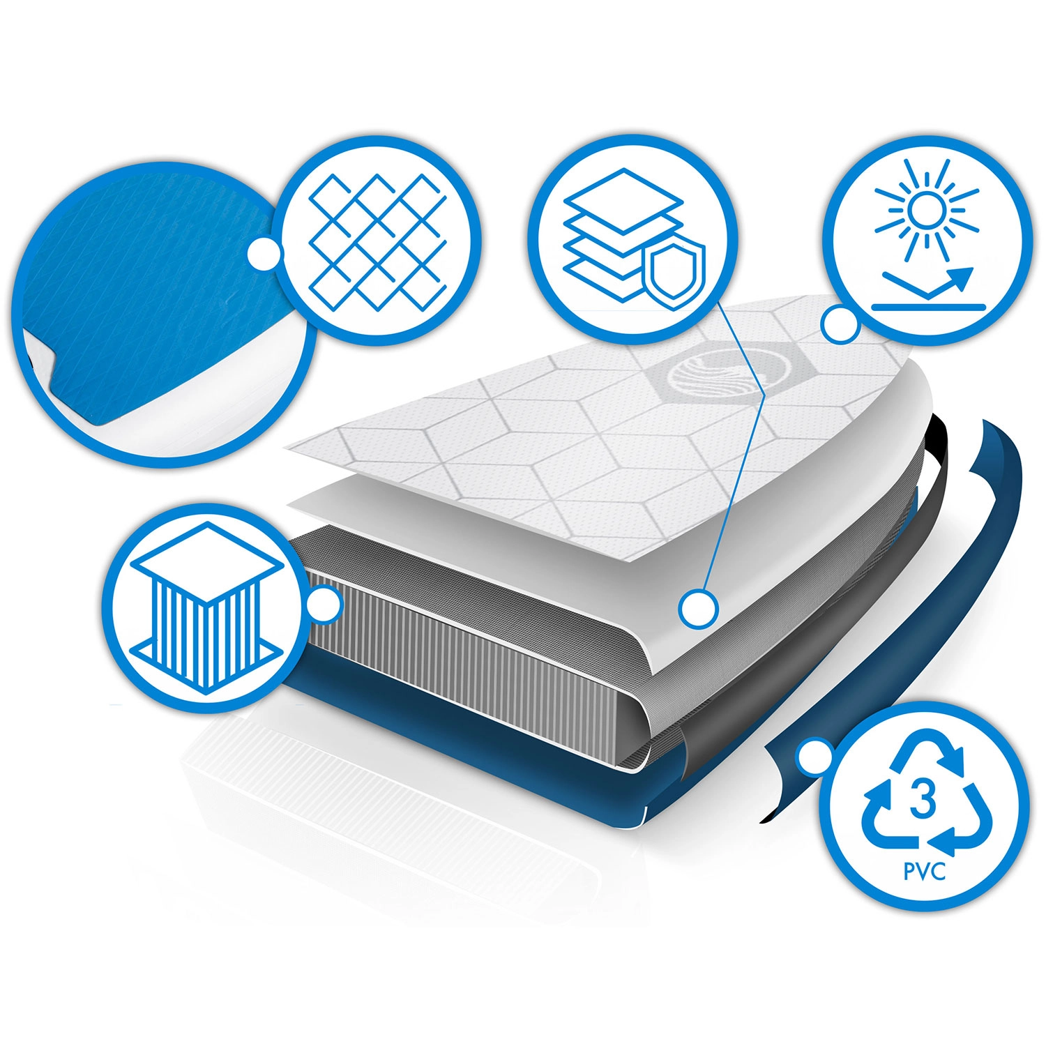 Mehrlagiges PVC, dichtes Drop-Stitch-Gewebe und verstärkte Nähte gewährleisten hohe Steifigkeit, UV-Beständigkeit und lange Lebensdauer. Rutschfeste EVA-Deckauflage für sicheren Stand.