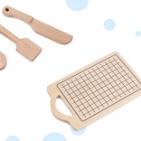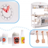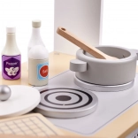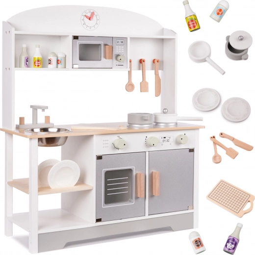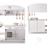 Stilvolle Holz-Kinderküche aus MDF in neutralen Farben für stundenlanges kreatives Spiel. Mit herausnehmbarem Metallspülbecken, Kochfeldern mit drehbaren Knöpfen, Backofen mit Fenster und Display, Mikrowelle sowie Abtropfgestell. Inklusive umfangreichem Holzzubehör (Topf, Pfanne, Teller, Messer, Löffel, Pfannenwender, Gewürzstreuer) und praktischen Haken und Ablagen zur Aufbewahrung. Sicher, glatt geschliffen und lackiert mit ungiftigen Farben.