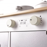 Zwei Kochfelder mit drehbaren Knöpfen, Backofen mit Sichtfenster und Timer-Aufdruck sowie praktische Mikrowelle. Kinder können sicher ausprobieren, wie echte Geräte funktionieren.