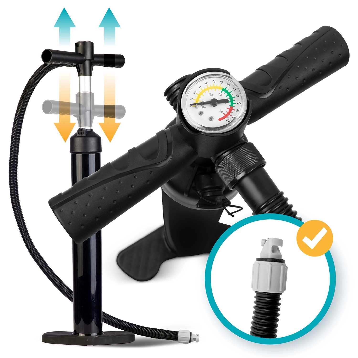 Leichtbauweise, mehrere Tragegriffe und ein robuster Rucksack ermöglichen komfortables Tragen. Die Doppelhubpumpe verkürzt die Aufpumpzeit, damit Sie schneller aufs Wasser kommen.