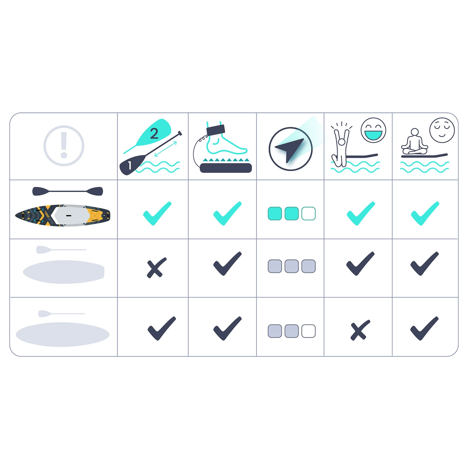 Enthalten sind eine Doppelhubpumpe mit Manometer für schnelles und sicheres Aufpumpen, ein verstellbares Aluminium-Paddel (162–210 cm) mit Schnellverschluss und ein Spiralleash mit Drehgelenk für maximale Bewegungsfreiheit. Ein robuster Rucksack mit Scheuerschutz erleichtert den Transport der gesamten Ausrüstung. UV-beständige Oberfläche und verstärkte Kanten verlängern die Lebensdauer auch bei intensiver Nutzung.