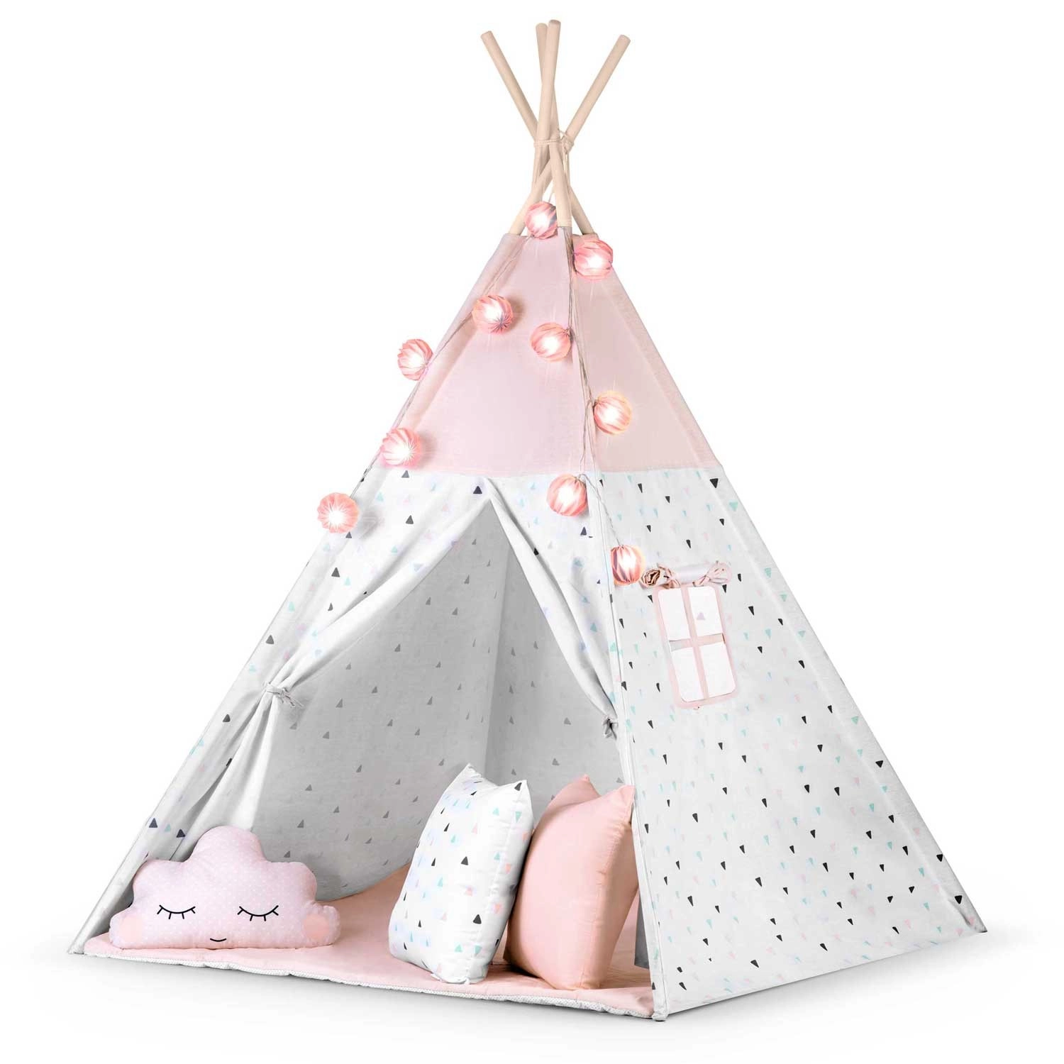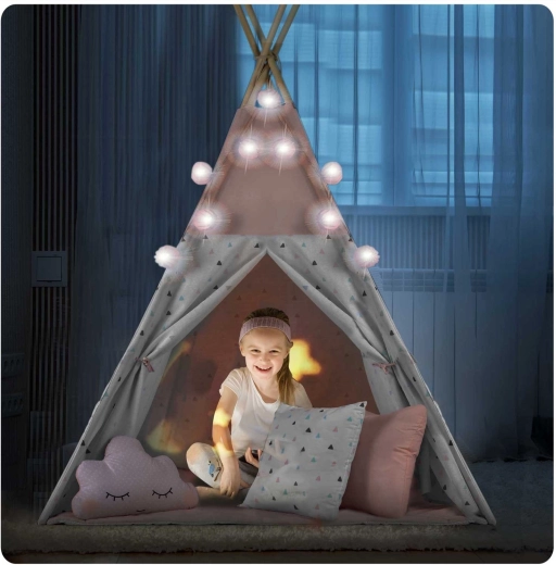 Zum Set gehört eine isolierende Unterlage mit rutschhemmenden Noppen, die vor Bodenkälte schützt und den Komfort beim Spielen und Lesen erhöht. Drei kuschelweiche Kissen sowie dekorative Lichterkette mit Girlande sorgen für eine gemütliche Atmosphäre. Das zu öffnende Fenster mit Rollo und der aufrollbare Eingang unterstützen fantasievolles Spiel und passen natürlich zu den Prinzipien der Montessori-Pädagogik.