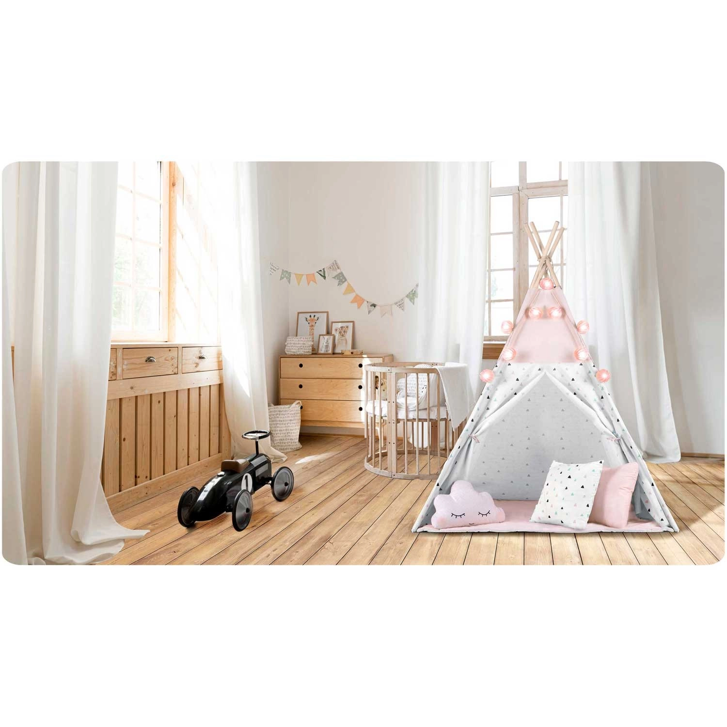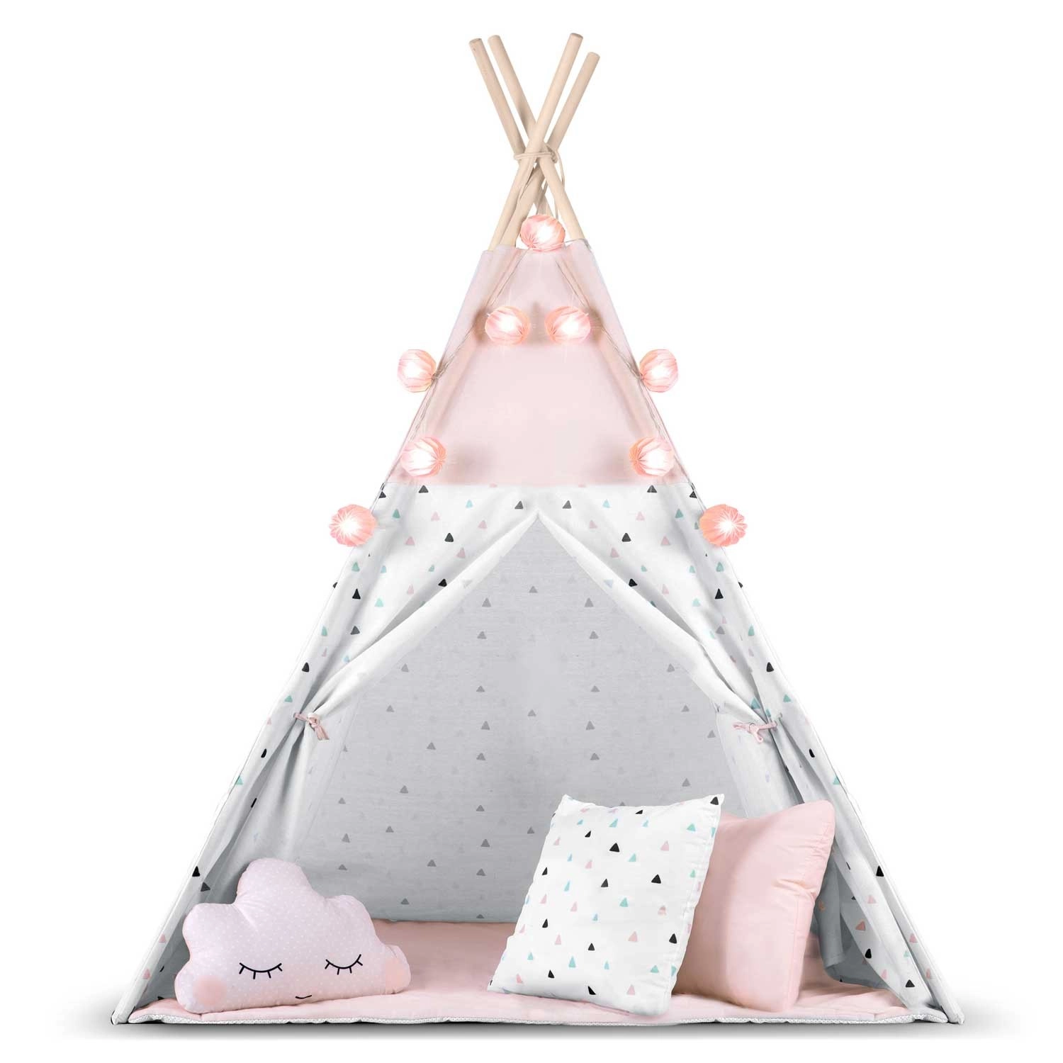 Im Lieferumfang enthalten sind 3 dekorative Kissen, eine weiche isolierende Unterlage mit Rutschschutz, eine Girlande, eine Lichterkette und eine Tasche. Alles, was Sie brauchen, um im Handumdrehen eine zauberhafte Spielecke zu schaffen.