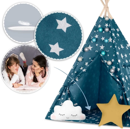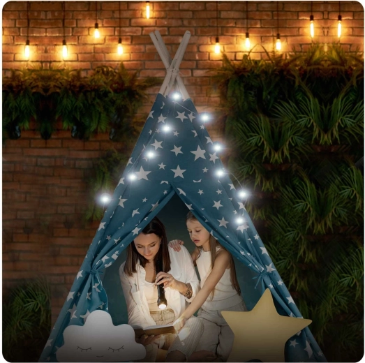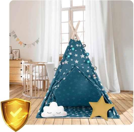 Die atmungsaktive 100% Premium-Baumwolle (175 g/m²) gewährleistet Luftzirkulation und hält auch den wildesten Abenteuern stand. Stabile Kiefernstäbe geben der Konstruktion sicheren Halt, gleichzeitig lässt sich das gesamte Tipi schnell zusammenklappen und transportieren – ins Wohnzimmer, ins Kinderzimmer oder draußen in den Schatten.
