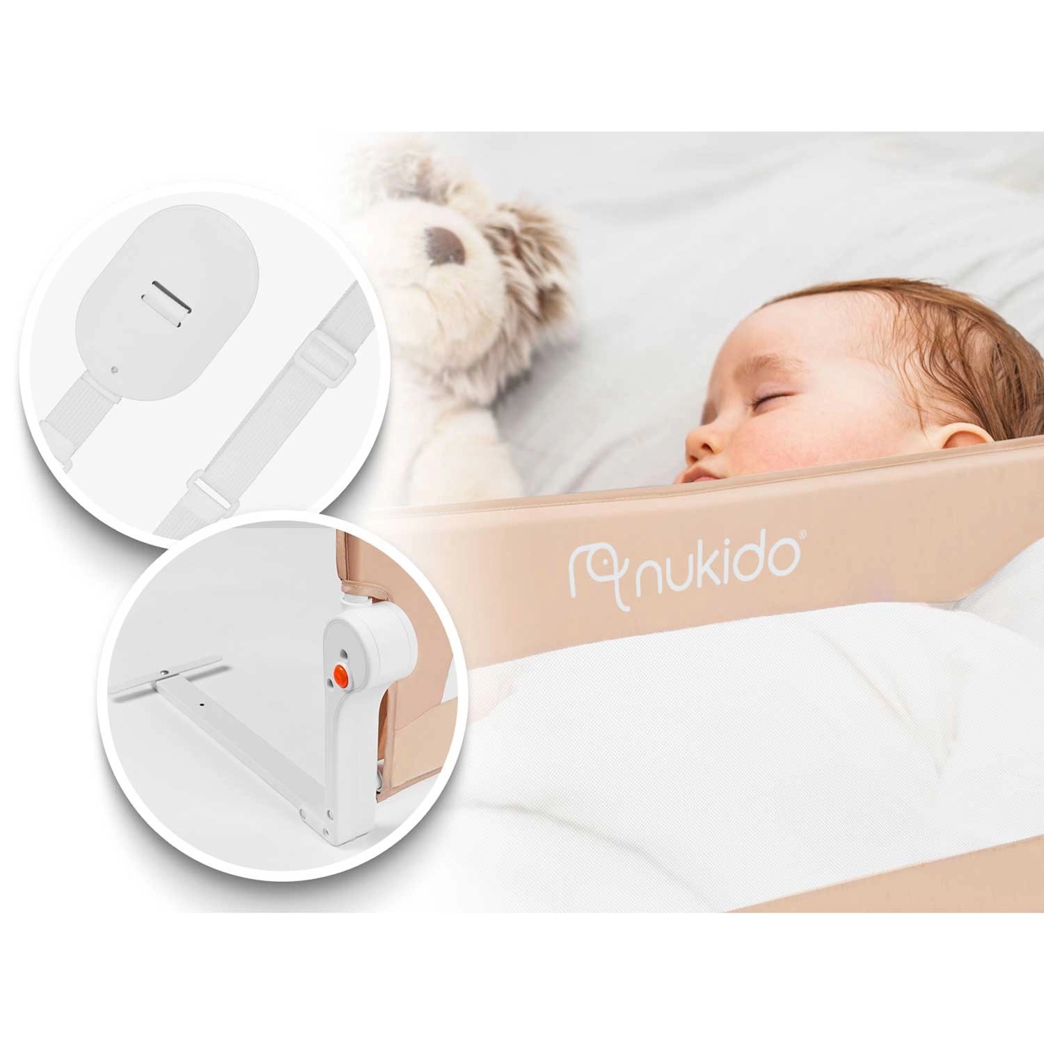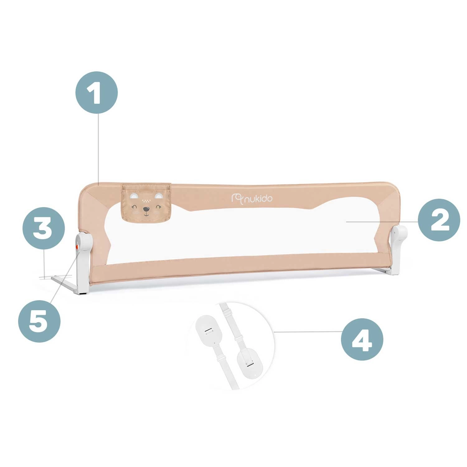 Das NUKIDO Bettgitter ist so konzipiert, dass es Kindern einen sicheren Schlaf und Eltern Ruhe bietet. Der robuste, zugleich leichte Stahlrahmen mit hochwertiger Verarbeitung hält dem täglichen Gebrauch stand, während das atmungsaktive Mesh-Gewebe Luftzirkulation und Sichtkontrolle des Kindes ermöglicht. Dank des Klappmechanismus mit bis zu 180° lässt sich das Gitter bequem abklappen, ohne es demontieren zu müssen.