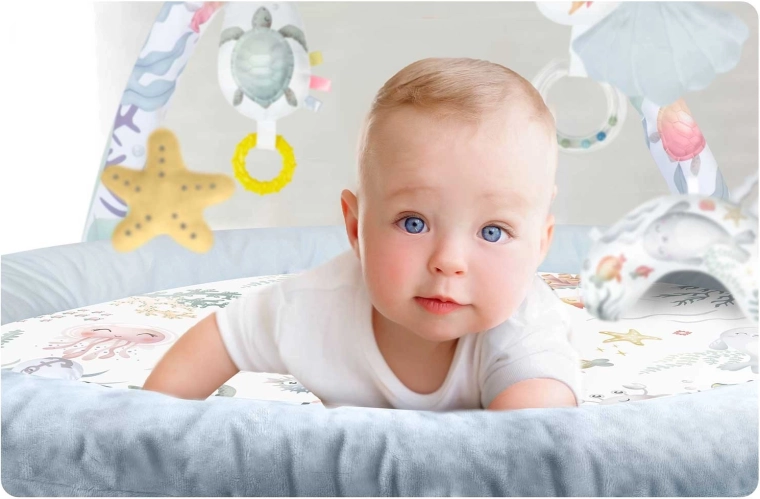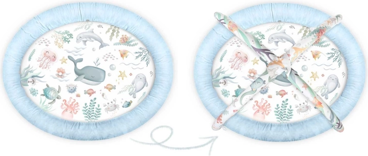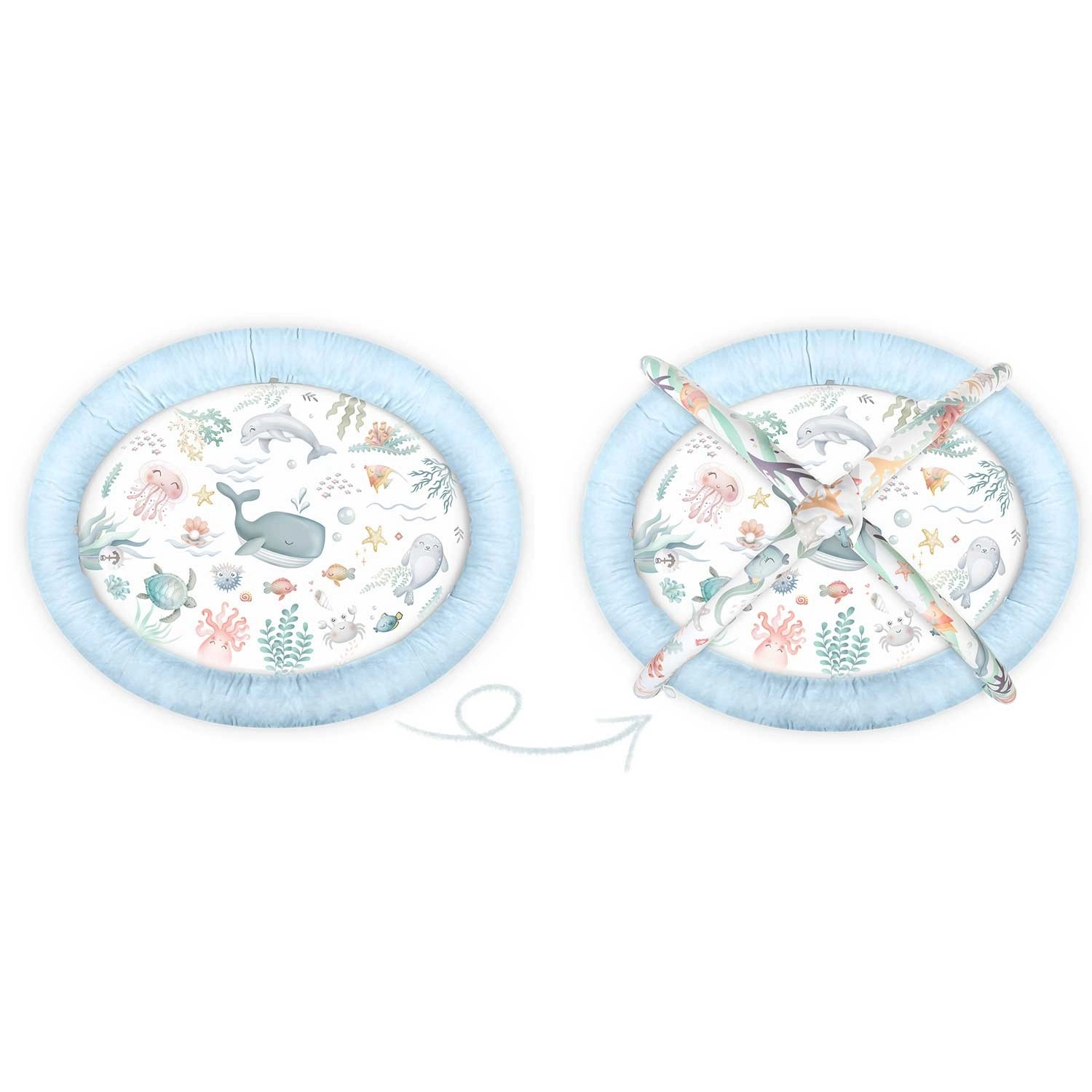 Die Spieldecke Nukido Ocean schafft eine gemütliche und sichere Umgebung für Neugeborene und größere Babys. Zwei sich kreuzende Bögen tragen abnehmbare Spielzeuge, die Sehen, Tasten und Hören fördern – vom Spiegel zur Selbsterkennung über Rasseln bis hin zu raschelnden Elementen und einer quietschenden Krabbe. Ebenfalls enthalten ist ein weiches Kissen für bequemes Spielen in Bauchlage.