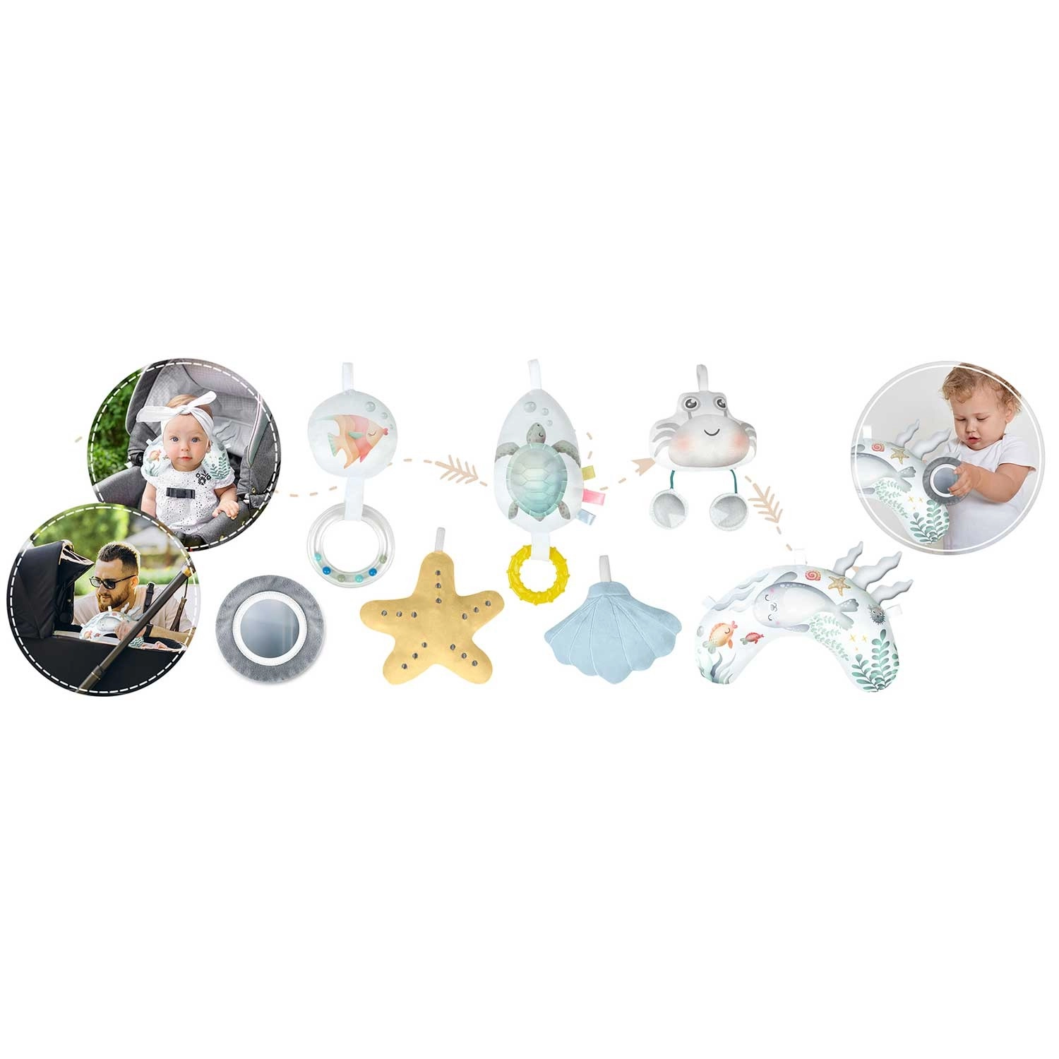 Spiegel, Rasseln, weiche Plüschfiguren und eine quietschende Krabbe fördern Sehen, Hören und Tasten. Die Spielzeuge können flexibel an den Bögen und an den Rändern versetzt werden.